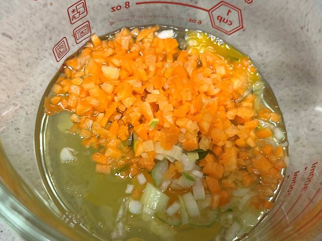 계란말이에 넣을 야채는 잘게 다져서 준비합니다. 파, 양파, 당근 등을 넣으면 잘 어울립니다. 당근처럼 딱딱한 야채는 최대한 작게 다져 주세요.
