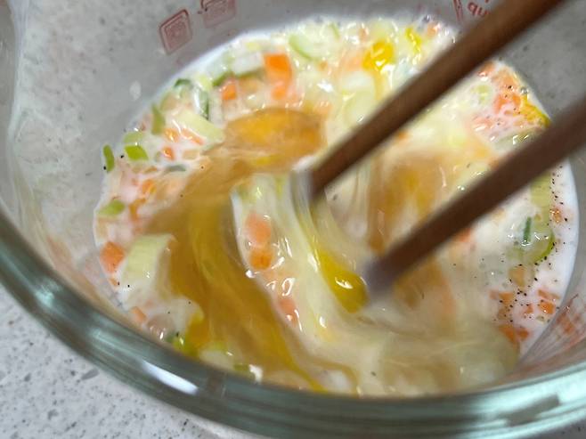 계란물을 잘 저어서 우유와 계란이 잘 섞이도록 합니다. 계란말이 할 때 우유를 소량 넣어주면 계란말이 식감이 훨씬 부드럽고 촉촉해져요.