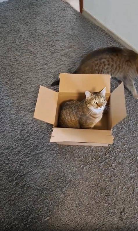카메라가 서서히 옆으로 돌아가며 공간을 비추자, 진짜 주인공은 뜻밖의 장소에 있었습니다. 바로 그 옆에 조심스럽게 놓여 있던 낡은 종이박스 속. 작고 구겨진 그 박스 안에 고양이는 몸을 꼭꼭 말아 넣은 채 평화롭게 앉아 있었습니다. 마치 "여기가 내 자리야"라고 선언하듯 편안한 자세였고, 그 눈빛에는 약간의 짓궂은 여유마저 담겨 있었지요.