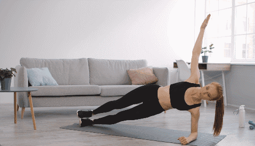 왼쪽 팔뚝을 매트에 대고 옆으로 누워 몸을 곧게 정렬합니다. 엉덩이를 들어 올려 사이드 팔꿈치 플랭크 자세를 만들고, 오른손은 공중으로 뻗어줍니다. 자세를 유지하며 버티세요.