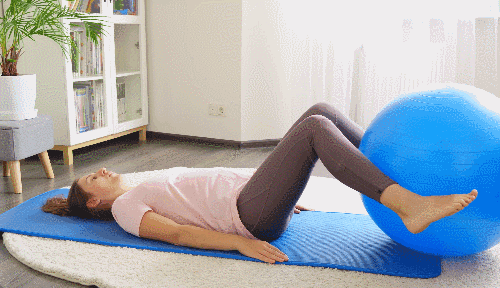 매트에 등을 대고 누운 후, 두 다리 사이에 짐볼을 끼워 고정합니다. 복부에 힘을 준 상태에서 다리를 들어 올렸다가, 조심스럽게 내립니다.