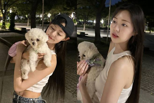 2일 SNS에 업로드된 사진 속 신슬기는 반려견과 함께 공원 밤 산책을 즐기는 모습이었는데요.