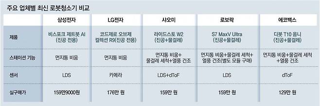 LG전자는 지난달 스테이션 ‘올인원타워’를 결합한 ‘코드제로 오브제컬렉션 R9’를 출시했다. 스테이션에서 로봇청소기의 먼지통을 비워주고 자외선 소독을 통해 세균 증식을 억제한다. 삼성전자의 ‘비스포크 제트 봇 AI’도 스테이션에서 먼지통을 비워준다. 다만 두 회사의 프리미엄 제품군에서는 아직 흡입과 물걸레 청소가 동시에 가능한 제품이 없다. 국내 업계 관계자는 “국내 기업들도 고객이 편리함을 느끼는 방향으로 제품 개발에 속도를 내는 중”이라고 했다.