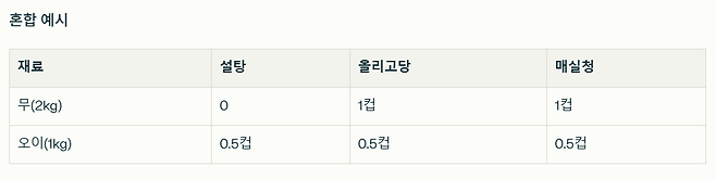- 무·오이 등의 장아찌 재료 준비 후,올리고당 또는 매실청을 설탕 대신(혹은 일부 혼합) 동일 비율로 사용