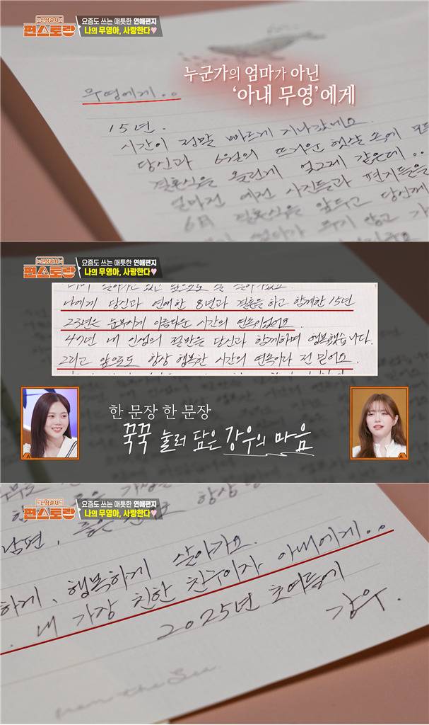 KBS 2TV ‘신상출시 편스토랑’에서는 김강우가 아내 한무영에게 지금까지 100통이 넘는 손편지를 써온 사연이 소개되었습니다. 김강우는 “1년에 3~4통씩 쓴다. 연애 초반에는 훨씬 자주 썼다”며 “23년 동안 100통은 넘게 쓴 것 같다”고 밝혔습니다. 그의 말처럼 방송에서는 실제로 김강우가 아내에게 보낸 손편지들이 공개되었고, 모든 편지는 ‘아내 무영에게’로 시작되었습니다.