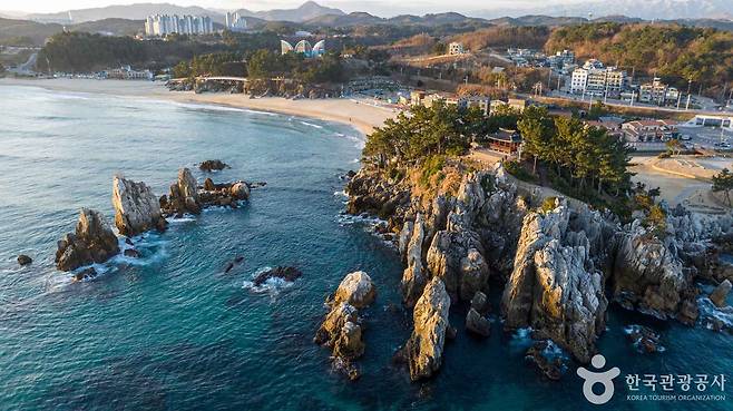 조금 더 남쪽으로 내려가면, 영화나 CF 속에서 본 듯한 풍경이 눈앞에 펼쳐집니다. 추암 촛대바위는 해안가에 우뚝 솟아 있는 기암괴석이 마치 촛불을 밝힌 형상으로, 특히 일출 명소로 이름난 곳이에요.