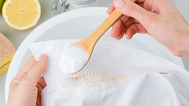 누렇게 변한 흰 옷을 담가 30분간 방치한다. 이때 너무 오래 두면 옷감이 손상될 수 있으니 주의한다.