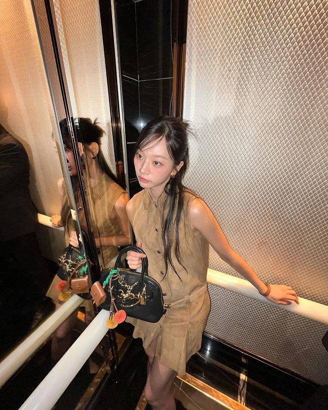 사진 속 혜리는 카멜색의 스웨이드 카라 원피스를 입고 시크한 코디를 선보였으며 , 스트라이프 티와 그레이 자켓을 걸쳐서 다양한 캐주얼룩을 선보였다.