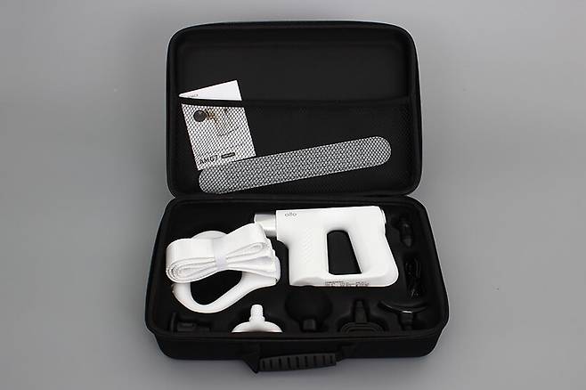 구성품은 마사지건 본체와 마사지 헤드, 마사지 벨트, 지압 패드, 충전 케이블, 그리고 사용 설명서로 이루어져 있다.