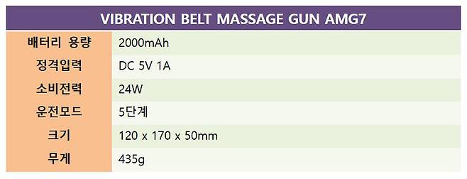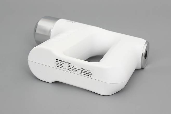 일반적인 마사지건이 대부분 핸드건 형태의 T자형인 것과는 달리 AMG7 마사지건 본체는 손잡이 아랫부분이 막혀서 마치 건타카를 연상케 하는 모습을 띄고 있다.