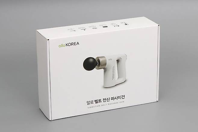 알로코리아 진동 벨트 마사지건 AMG7은 흰색 박스에 담겨있는데, 박스에 제품 이미지가 인쇄되어 있어서 제품의 외형을 가늠하기는 어렵지 않다.