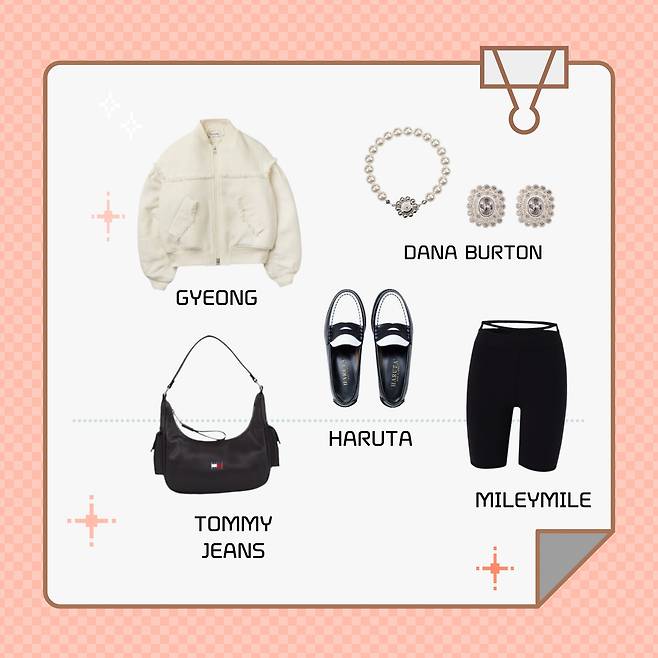 먼저 첫번째룩은 아이보리컬러 아우터, 블랙 바이커쇼츠 여기에