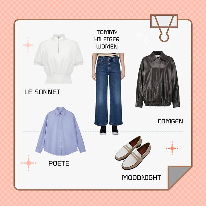 마지막룩은 가을 캐주얼 출근룩이야!!아무래도 날씨가 일교차가 심하니 아우터는 컴젠 레더자켓이 필수지!활용성 좋은 르쏘넷 나일론 탑도 좋고,포에트 셔츠도 이너로 좋을거 같아~타미힐피거 우먼 데님진에 브라운 로퍼로편하고 예쁘게 마무리하자!