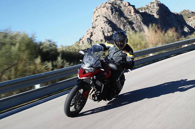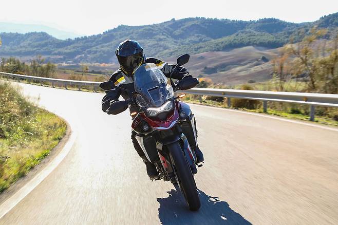 GT 프로를 본격적으로 몰기 위해서 리어 프리로드와 댐핑을 조였다. 주행모드를 바꾸면 전자식 리어 쇽의 댐핑 값이 즉각 변경되고 라이더의 취향에 따라 10단계로 조절할 수 있다. 또한, 라이더 모드에 원하는 서스펜션 설정을 비롯해 각종 전자장비 세팅까지 적용해두면 나만의 주행모드로 사용할 수 있다.초반 펀치력은 그리 놀랍지 않다. 하지만, 정지 상태에서 바이크가 움직이기 시작하는 구간의 토크가 보강됐다. 3기통 엔진 특유의 낮은 rpm에서의 불안정함이 대부분 해소되면서 클러치웍에 대한 부담이 줄었다. 토크가 희미한 듯 느껴지지만, 실제로 시동을 꺼뜨리는 경우가 줄었다. 핸들 바가 가까워진 만큼 직진 안정성이 좋아졌고 바이크의 움직임도 더 여유로워졌다. 이전 모델이 상체를 제대로 숙이고 강하게 몰아야 즐거웠다면 새로운 GT 프로는 편안한 자세와 여유로운 표정으로 사이코패스처럼 빠르게 달릴 수 있다. 보통 무게중심이 높은 어드벤처 투어링의 경우 절대 속도 영역이 올라갈수록 안정성이 급격하게 떨어진다. 그래서 차근차근 페이스를 높이며 선두 차량을 자극했더니 끊임없이 빨라진다. 그 탓에 도로 규정 속도가 어떻게 됐는지 기억이 가물가물할 정도로 정신없이 달렸다. 지난 프레젠테이션에서 확인했던 것처럼, rpm을 끝까지 쥐어짰을 때 비로소 새로운 GT 프로의 진가를 맛볼 수 있다. 오버리터급의 폭발적인 토크나 가속력은 없지만, 미들급이라는 것이 놀라울 정도로 여유롭고 끈기 있는 가속력을 제공한다. 여기에 가장 놀라운 건 어떤 순간에도 한치의 불안함이나 위험이 없었다는 것이다. 전방에 적용된 320mm더블디스크와 브렘보 스틸레마 캘리퍼의 제동 성능은 의심의 여지가 없다. 미친 듯이 달리다가도 제동이 필요하다 싶을 땐 원하는 위치에 원하는 속도까지 제동한다. 물론, 성능 차이가 크게 와 닿지 않지만, 은근슬쩍 프런트 브레이크 디스크와 리어 브레이크 시스템을 저가 제품으로 변경한 건 좀 아쉽다. (시승 당시에 테스트 라이더 아무도 눈치 채지 못했다. 웃음)
