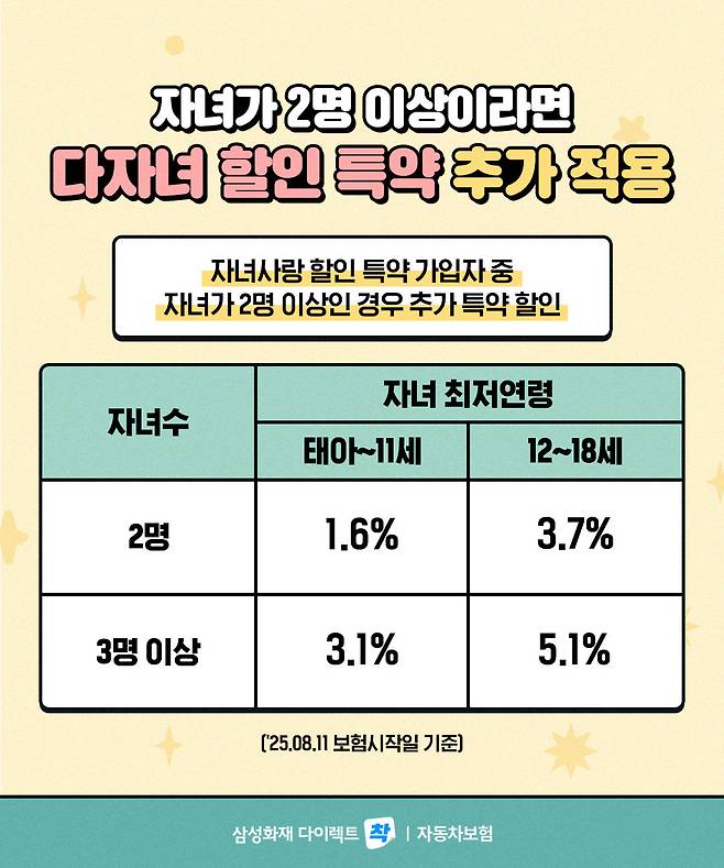 자녀가 2명인 경우, 가장 어린 자녀의 연령을 기준으로 태아에서 11세까지는 1.6%, 12세에서 18세까지는 3.7%가 할인되며 3명 이상의 경우 태아~11세는 3.1%, 12~18세는 5.1%가 특약 할인됩니다. (‘25.08.11 보험시작일 기준)