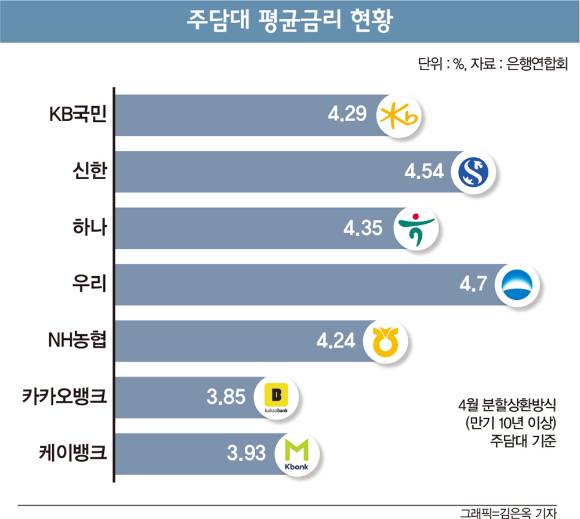 4월 5대 은행 주담대 평균금리(4.24~4.70%)와 비교하면 확연히 낮은 수준입니다.