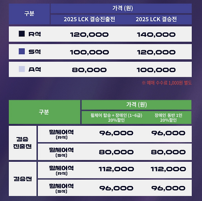 좌석 가격은 좌석 등급에 따라 차등 적용됩니다. 결승진출전 기준으로 R석은 12만 원, S석은 10만 원, A석은 8만 원이며, 결승전은 각각 2만 원씩 인상된 가격으로 책정되어 있습니다. 휠체어석과 장애인 할인석은 별도로 운영되며, 전화 예매를 통해 신청해야 합니다. 해당 좌석은 20% 할인 혜택이 제공되며, 자세한 내용은 NOL 고객센터를 통해 확인할 수 있습니다.
