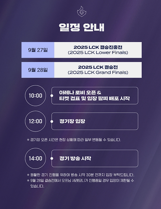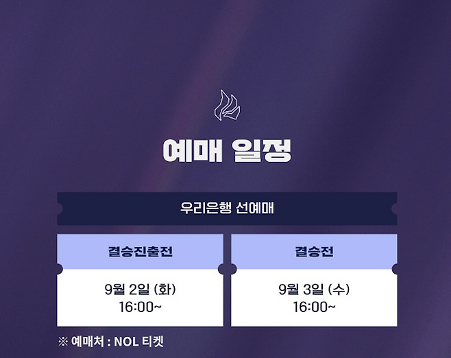 이번 결승전은 9월 27일과 28일 양일간 진행되며, 각각 결승진출전과 결승전으로 나뉘어 열립니다. 예매는 9월 2일과 3일 오후 4시에 각각 오픈되며, NOL 티켓 플랫폼을 통해서만 가능합니다. 예매 수수료는 1,000원이 별도 부과되며, 모든 좌석은 모바일 티켓 형태로 발급됩니다.