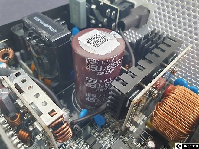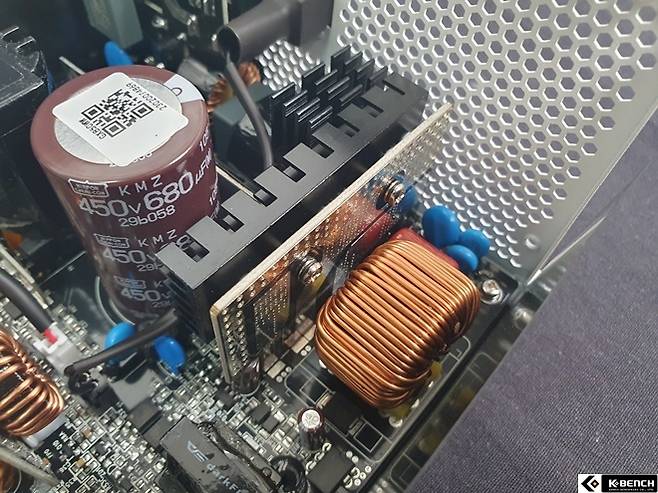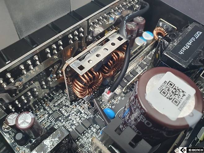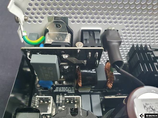 특히 EMI 노이즈 필터는 외부 전원부를 관리하는 부분에 붙어있는 중요한 요소중 하나인데, 타 파워들보다 확실히 탄탄하고 견고한 기판 방식의 구성을 제공하는 모습이였다. 이 필터는 여러 전기적인 노이즈를 필터링 해주기도 하며 직접적으로 외부 전원 부와 맞닿아 있는 부분이니 만큼 안전하고 문제없는 전력 공급을 위한 탄탄한 구성이 필수다.