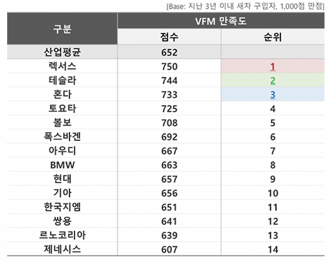 소비자리서치 전문기관 컨슈머인사이트는 ‘연례 자동차 기획조사(매년 7월, 약 10만명 대상)’에서 새 차 구입 후 3년 이내인 소비자에게 연비, 차량가격, 옵션가격, 유지비용, 사후서비스(AS) 비용, 예상 중고차 가격 6개 측면에서 얼마나 만족하는지를 평가하게 하고 결과를 종합해 ‘비용 대비 가치(VFM : Value For the Money) 만족도’(1000점 만점)를 산출했다.