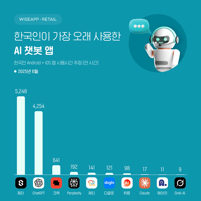 지난 달 국내 인공지능(AI) 챗봇 앱 중 가장 오래 사용된 서비스는 챗GPT가 아닌 스캐터랩의 캐릭터 챗봇 ‘제타(zeta)로 나타났다. 이용자 수는 챗GPT가 앞섰지만, 사용 시간에서는 제타가 크게 우위를 점했다. 이는 모바일 환경에서 생산성보다 ‘엔터테인먼트형 AI’가 더 긴 체류 시간을 유도한다는 점을 의미한다.