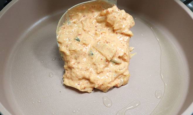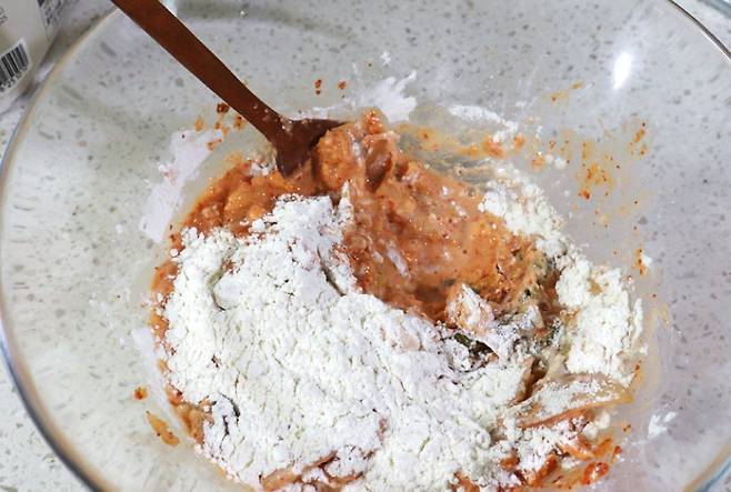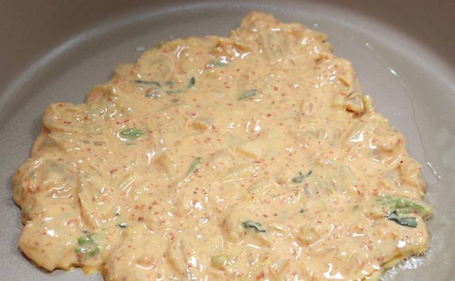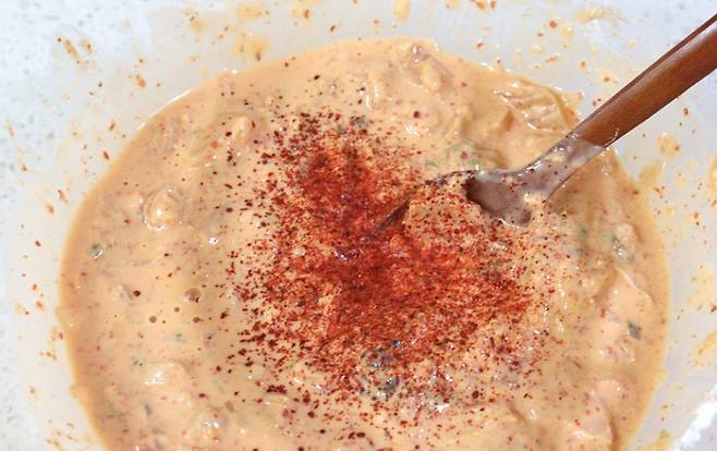 김치랑 부침가루만 섞으면 반죽 색이 좀 밋밋해 보여요. 고춧가루를 살짝 넣어주면 훨씬 먹음직스럽게 보여요.