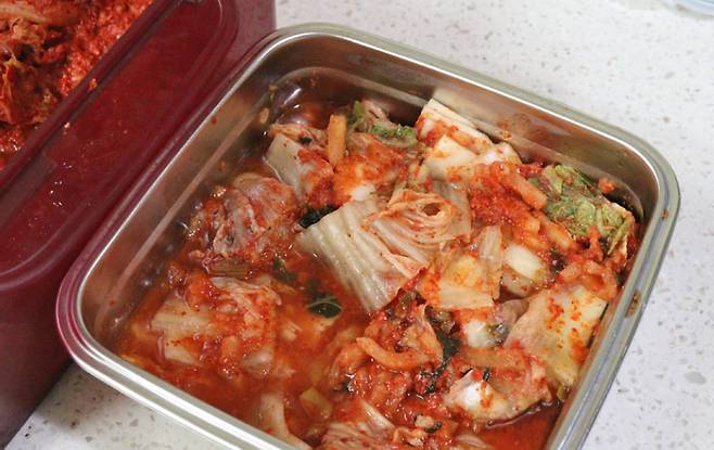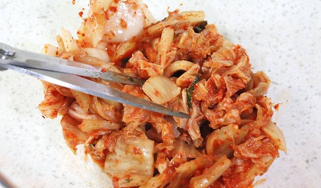 김치를 도마에서 썰면 국물이 다 스며들어서 치우기 귀찮죠. 이럴 땐 가위로 뚝뚝 잘라주면 간편하고 깨끗해요.