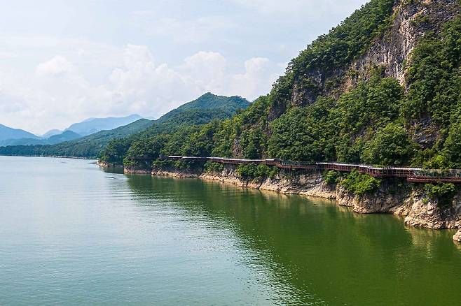 단양강을 따라 절벽에 설치된 길인 단양강 잔도는 스릴과 아름다움을 동시에 느낄 수 있는 명소입니다.