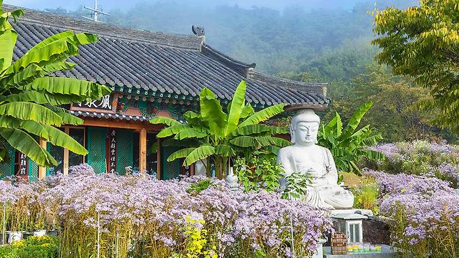 신비로운 이야기와 함께 이 가을, 사찰 주위를 감싸는 연보라빛 개미취는 자연과 전설이 하나가 된 듯한 몽환적인 풍경을 빚어냅니다.