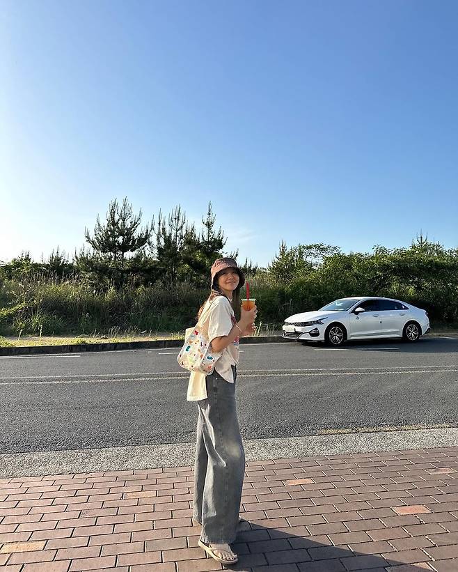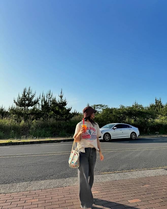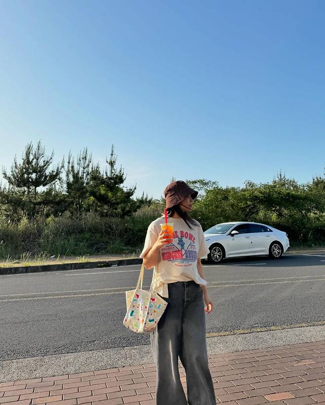 사진 속 박지윤은 프린팅이 되어 있는 흰 반팔티와 5부 블랙 레깅스를, 또 다른 사진에는 와이드 청바지를 입고 백과 모자를 써서 캐주얼한 데일리룩을 선보였다.