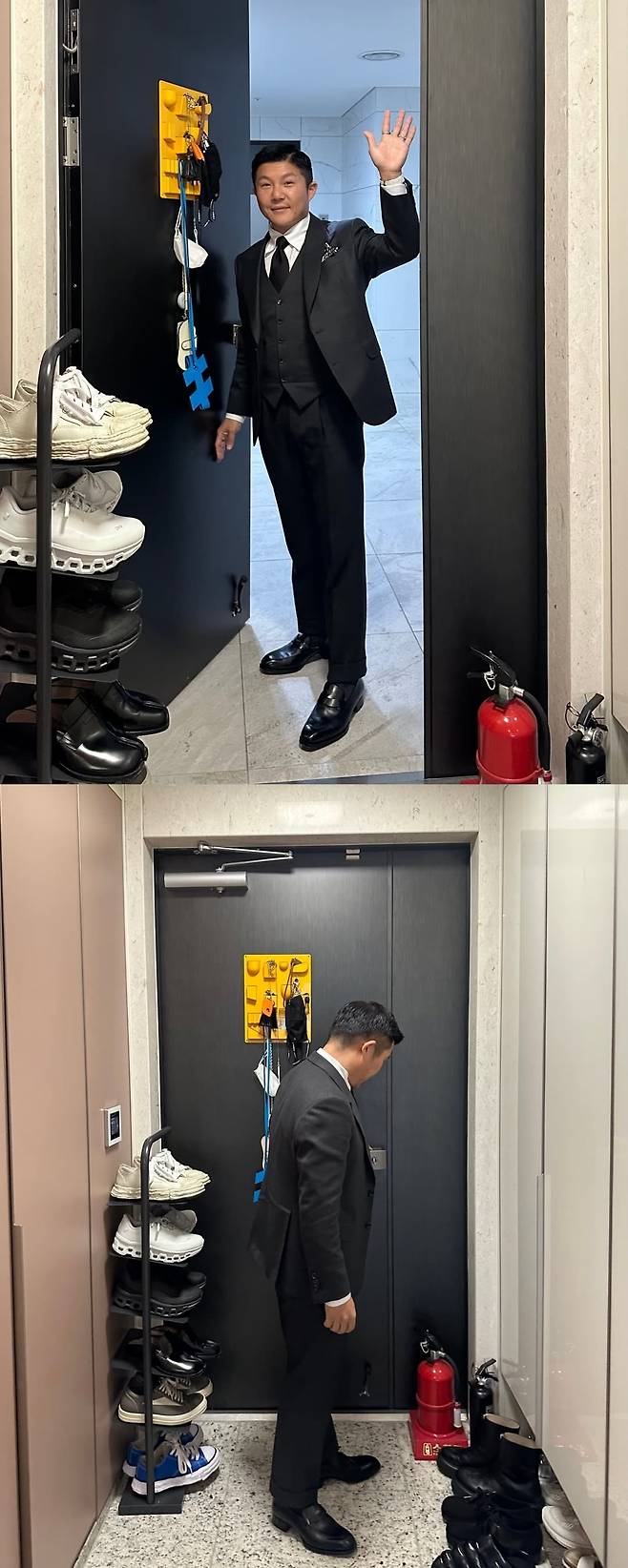 특히 슈트 차림으로 현관 앞에서 손을 흔드는 모습은 누군가를 배웅하거나 인사하는 듯한 자연스러운 장면으로 눈길을 끌었다. 당연히 와이프가 아닐까. 결혼 이후에도 변함없는 유쾌한 분위기를 보여주며 팬들의 관심을 모았다.