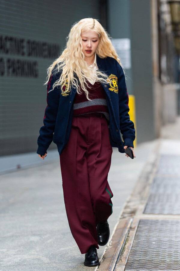 와인 컬러로 상하의를 맞춘 로제는 팬츠에 청록색 사이드 포인트가 더해져 어찌보면 해리 포터가 생각나는 듯한 느낌도 있지만, 전체적으로는 스포츠룩을 표방하면서 블랙 옥스포드화로 무게감을 더해 주었다.