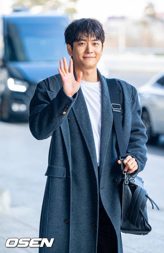 배우 강태오가 출국에 앞서 포즈를 취하고 있다.