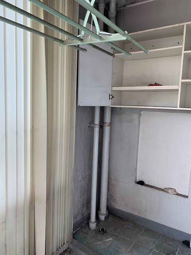 거실 쪽 베란다는 확장을 진행했지만, 안방 쪽 베란다는 세탁실로 이용하기 위해 그대로 두었어요. 누수의 흔적도 있고, 벽면에 곰팡이도 많았던 공간이에요.