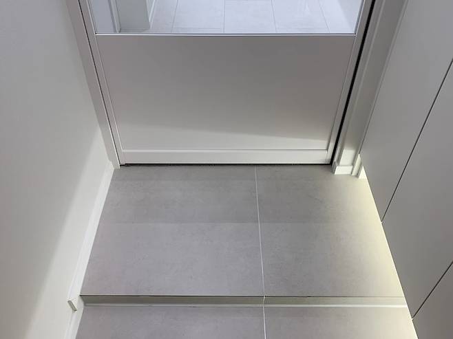 현관 바닥은 600x600 포세린 타일로 시공했고, 신발을 벗고 중문을 열기 전에 발을 디딜 공간을 만들어주셔서 정말 편리해요. 신발장 하부는 자주 신는 신발 보관이 편리하도록 띄우고, 조명을 설치했어요.