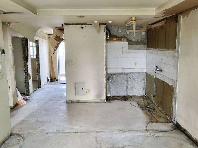 확장을 위해 철거한 모습인데, 날개벽이 그대로 남아있어요. 윗면도 철거가 불가능하다고 해서 속상했던 기억이 나요. 저 공간이 생각보다 좁지 않아서 철거가 완전히 되었다면 지금보다 더 넓게 공간 활용이 가능했을 텐데 아쉬워요.