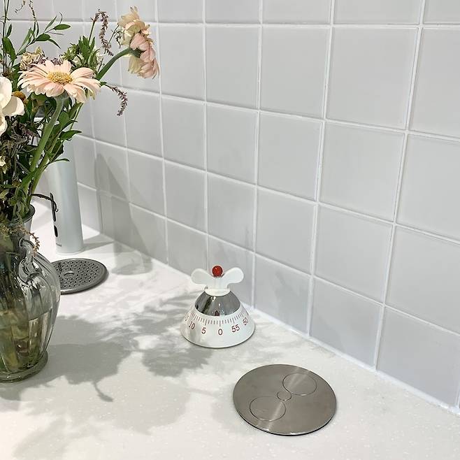 아일랜드에는 믹서기나 휘핑기 등 소형가전을 이용할 수 있도록 저의 로망이었던 바흐만 콘센트를 매립했어요. 사실 사용하기에 편하진 않지만 예뻐서 용서되는 아이템이에요.