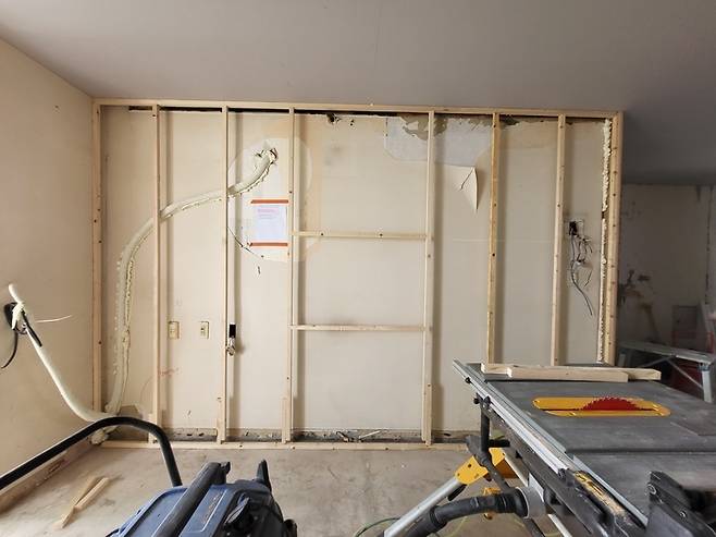티비 반매립을 위해 가벽을 설치하는 모습이에요. 길게 이어지는 배관은 무엇이냐면요. 거실 가벽을 통해서 침실 벽걸이 에어컨 배관을 매립하면 침실에서 배관이 보이지 않게 에어컨 설치가 가능하다는 글을 보고, 에어컨 배관 매립 업체를 섭외해 본격적인 공사 전 미리 매립을 진행했어요. 에어컨 배관 매립을 함께 진행했기 때문에 가벽 두께는 약 10cm 정도로 그만큼 거실이 좁아졌지만 여러모로 깔끔해서 매우 만족해요.