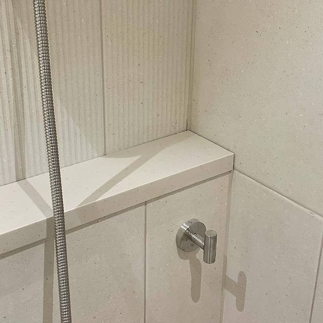 원래는 라이트그레이 색상 위주로 타일을 보러 다녔는데요. 집이 전체적으로 화이트 톤이라 욕실은 따듯한 느낌이 좋을 것 같아서 아이보리 베이지 톤으로 바꿨어요. 욕실에서 저만 아는 귀여운 포인트는 젠다이 위쪽으로 템바보드 디테일이 있는 타일로 시공했다는 거예요. 별거 아닌데 생각보다 예뻐서 기분이 좋아요.