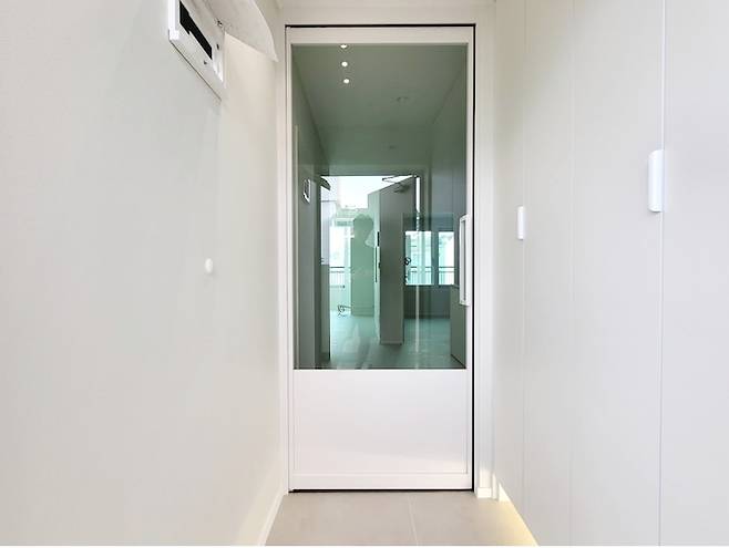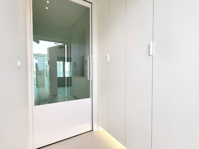 복도식 아파트 특성상 소음에 취약하고, 외부에 샷시 설치가 안 되어 있어서 중문을 필수로 생각했어요. 개인적으로 3단 슬라이딩 도어를 선호하지 않는데, 턴키 업체에서 스윙도어를 추천해 주셔서 스윙으로 했어요. 디자인은 원래는 하단 막힘이 없는 전체 유리로 결정을 했다가, 마감 전에 급하게 막힘이 있는 제품으로 변경했는데 너무 잘한 선택이었던 것 같아요. 청소를 자주 하는 편이긴 하지만 그래도 자주 신는 신발들이 꺼내져 있을 때 집 안에서 보이면 신경 쓰일 것 같더라구요.