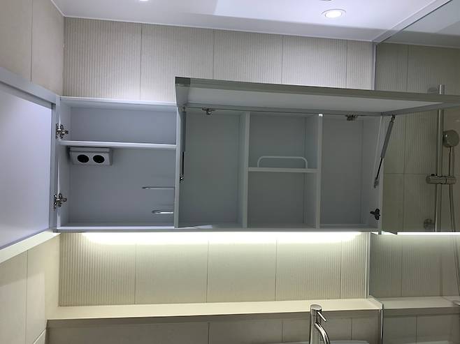 욕실 거울장은 슬라이딩장을 선호하지 않아서 플랩장과 여닫이가 합쳐진 제품으로 제작 요청드렸어요. 왼쪽은 여닫이라서 자주 쓰는 드라이어를 수납하기 좋고, 플랩장은 수건과 욕실 용품 여분을 넣어두었어요. 콘센트도 잊지 않고 설치해 주셔서 편하게 사용 중이에요. 수전과 악세사리는 모두 무광 크롬 제품으로 통일했어요.