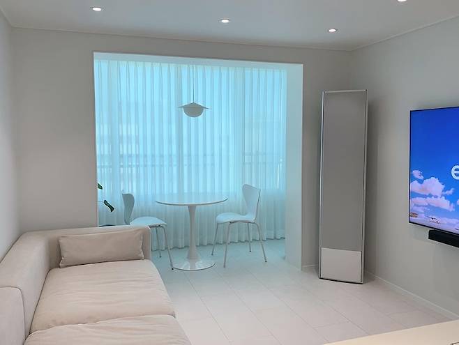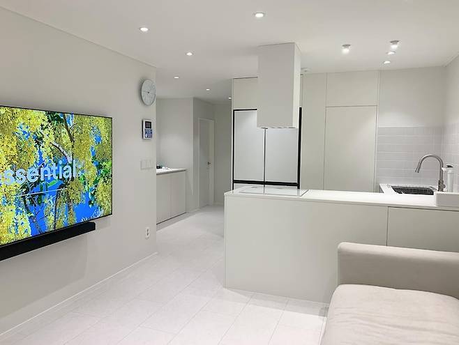 티비와 침대는 거거익선! 을 외치는 남편 덕에 벽면을 가득 채운 75인치 티비예요. 아무리 생각해도 너무 크다 싶었는데 또 지내다 보니 적응돼서 거거익선 맞는 것 같아요!ㅎㅎ 원래 티비를 잘 안 보는 성향인데, 거실에 커다란 티비가 걸려있으니 집에 들어오면 자동으로 티비부터 켜는 건 단점이에요.