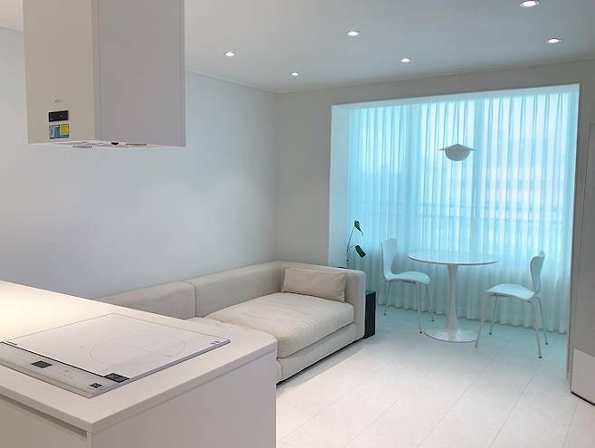 완성된 최종 모습이에요. 지금의 주방 구조를 위해 거실이 좁아졌지만 후회하지 않아요. 아 그런데 온통 화이트로 가득 찬 공간이라서 요리를 할 때마다 마음이 조마조마한 단점이 있어요. ㅎㅎ