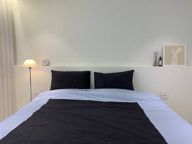 대신 침대 옆에 플로어 조명을 두었고, 헤드보드 필름까지 화이트로 했기 때문에 베딩으로 포인트를 줬어요. 매트리스는 남편이 거거익선을 외쳐서 라지킹(가로 1800)으로 구입했어요. 방을 정말 가득 채우는 크기에 처음엔 반대했지만, 막상 사용해 보니 넓어서 수면의 질이 올라가는 것 같아요.