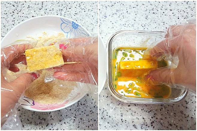 먼저 카레부침가루를 묻혀 계란물로 옷을 입혀 줍니다. 카레부침가루는 얇게 묻힐 수 있도록 한번 가볍게 탁탁 털어주고 계란물에 담가 주시면 좋습니다.