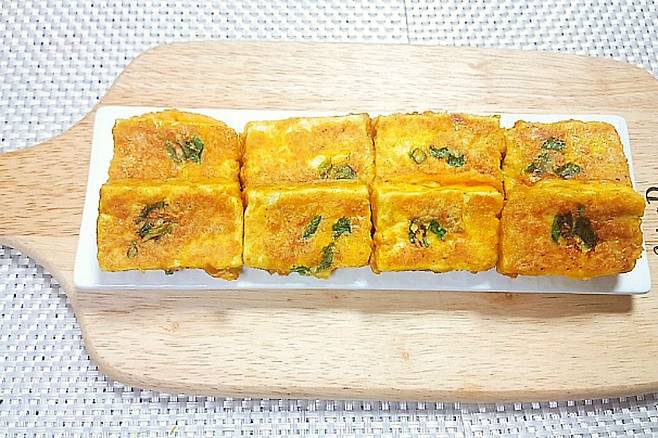 한 개 먹어보니 카레향이 가득한 계란물로 옷 입어 너무 맛있네요. 두부 안 좋아하는 가족도 맛있게 잘 먹더라고요.