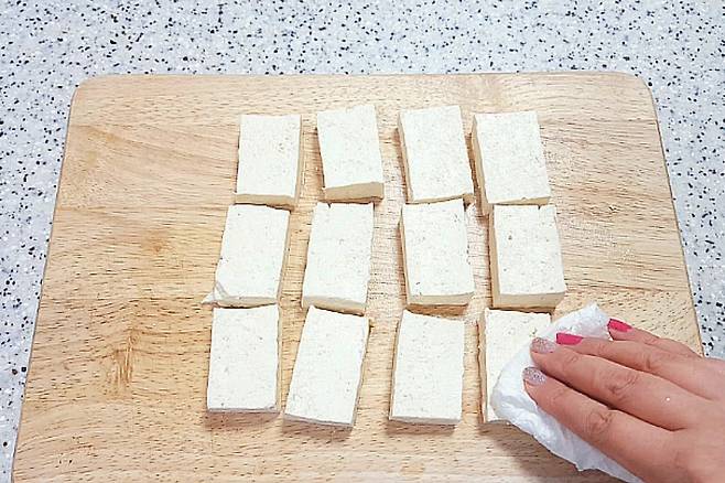 먼저 두부를 먹기 좋게 잘라주시고요. 키친타월로 두부의 물기를 제거해 줍니다.