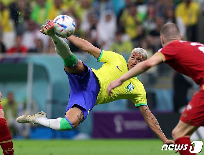 (로이터=뉴스1) 이유진 기자 = 2022 국제축구연맹(FIFA) 카타르 월드컵의 강력한 우승 후보인 브라질이 첫 경기에서 히샬리송의 멀티골을 앞세워 승리를 챙겼다. 브라질은 25일(한국시간) 카타르 루사일의 루사일 아이코닉 스타디움에서 열린 G조 조별리그 1차전에서 세르비아를 2-0으로 제압했다. 후반 28분 히샬리송이 환상적인 오버헤드킥을 성공시키며 전 세계의 팬들의 환호를 자아냈다.
