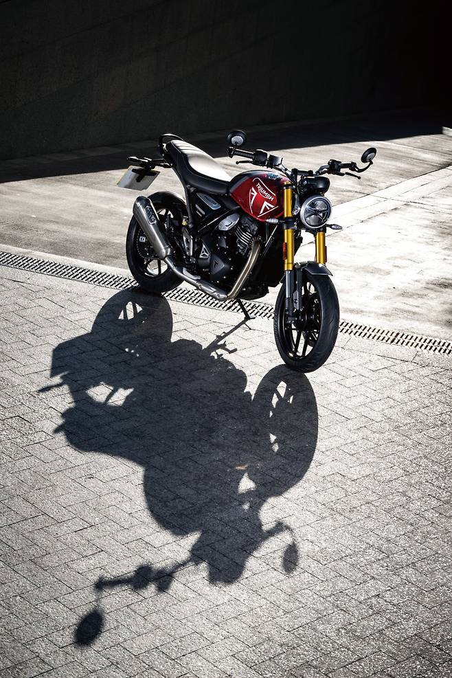 스피드 400은 이름처럼 스피드트윈 시리즈와 스타일, 그리고 재미까지 닮아있다. 먼저 디자인을 살펴보자. 차체의 볼륨이 좋고 사이즈가 적당하다. 지나치게 미니바이크같은 느낌도, 차체를 쓸데없이 키웠다는 느낌도 없는 적당한 선을 잘 지키고 있다. 790mm의 시트고도 만만하고 170kg의 가벼운 차량중량은 직접 다뤄보면 더 가볍게 느껴진다. 마감에 대한 의견은 사람마다 조금 갈린다. 분명 클래스 내에서는 최고 수준의 마감을 보여주지만 트라이엄프 바이크가 보여준 품질 기준에는 조금 미치지 못하는 느낌이다. 하지만 깔끔한 페인팅 품질과 차체 전반의 플라스틱 느낌이 나지 않도록 마감된 부분, 복잡한 배선 등을 말끔히 처리한 것을 보면 역시 트라이엄프구나 싶다. 두 모델에 공통으로 탑재되는 엔진은 398cc 수랭DOHC 방식으로 40마력의 최고출력에 37.5 Nm의 최대토크를 내는, 스펙상으로도 꽤 준수한 성능이다. 라디에이터를 세로로 배치해 존재감을 줄이고 냉각핀을 살려 공랭엔진 느낌을 더한 것은 본네빌 시리즈와 같은 아이디어다. 토크는 저회전부터 끈기 있게 나와주고 5,000~8,000rpm 구간이 가장 맛있는 구간이다. 고회전으로 갈수록 토크가 살짝 뭉툭해지는 느낌이지만 회전 관성이 더해지며 망설임 없이 쭉쭉 뻗는다. 진동도 잘 억제되어 회전제한까지 돌려도 부담스럽지 않다. 다만 7,000rpm을 넘으면 백미러의 상이 흐려질 정도로 진동이 올라온다. 엔진의 회전제한은 대략 9,500rpm에서 걸린다. 한참 짜릿해지려는데 ‘턱’하고 제한에 걸리는 느낌이라 500rpm만이라도 여유가 있으면 좋겠다.