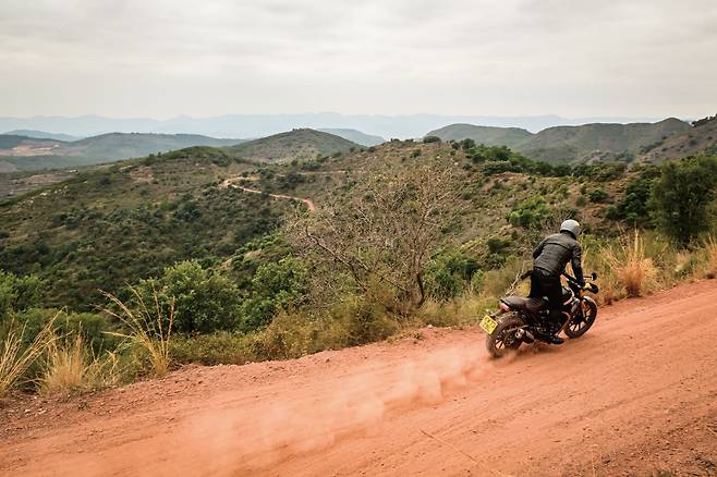 스크램블러 장르의 핵심은 역시 오프로드 성능이 아닐까? 오프로드에서 마주치는 요철의 충격을 줄이기 위해 작동 거리가 150mm로 길어진 서스펜션, 요철을 더욱 쉽게 넘어가기 위해 사이즈를 키운 프런트 휠, 블록패턴이 가미된 메첼러 카루스트리트 타이어, 그리고 트랙션 컨트롤과 ABS를 해지하는 오프로드 모드까지. 흙길 위를 휘저을 만반의 준비가 되어있다. 전체 코스 중에서 오프로드 주행은 촬영 위주의 오프로드의 맛만 보는 정도로 짧았다. 하지만 차체 특성을 파악하기에는 충분했다. 결론부터 이야기하면 오프로드를 상당히 재밌게 탈 수 있는 바이크다. 엔진의 출력은 오프로드에서의 그립을 쉽게 넘어설 수 있을 정도로 강해서 슬금슬금 미끄러지는 리어를 달래가며 가속하는 재미가 있다. 서스펜션 작동폭을 늘렸지만 한계까지 쉽게 도달하고 고정된 댐핑 설정은 온로드 세팅에 가까워 프론트 휠의 그립감을 느끼기 어려웠다. 하지만 무엇보다 재밌다. 스크램블러니까, 납득 할 수 있는 정도의 성능을 갖추고 한계 안에서 달리는 재미는 충분했다. 캐스트 휠에 대한 불만도 없었다. 애초에 캐스트 휠이 찌그러질 것을 걱정할 정도의 험로나 오프로드에서 고속으로 달리는 바이크가 아니다. 뽀얀 먼지를 내며 달려와 부드럽게 코너를 돌아 다시 엉덩이를 좌우로 씰룩이며 가속해나가는 재미, 이게 스크램블러의 핵심 아닐까? 오프로드 코스가 짧은 것이 못내 아쉬웠다.
